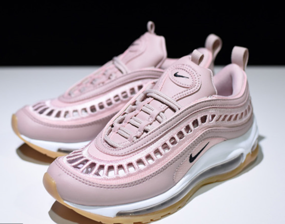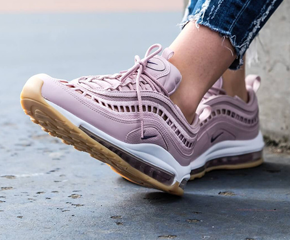 에어맥스 97에 2017년 버전 에어맥스 97 울트라 우먼스 전용 모델 에어맥스 97 파티클 로즈인데요. 전체적인 고급스러운 핑크 벨벳 소재에 띠 부분은 연블루 컬러에 바닥 아웃솔까지 연핑크로 여성 취향 저격 모델입니다.